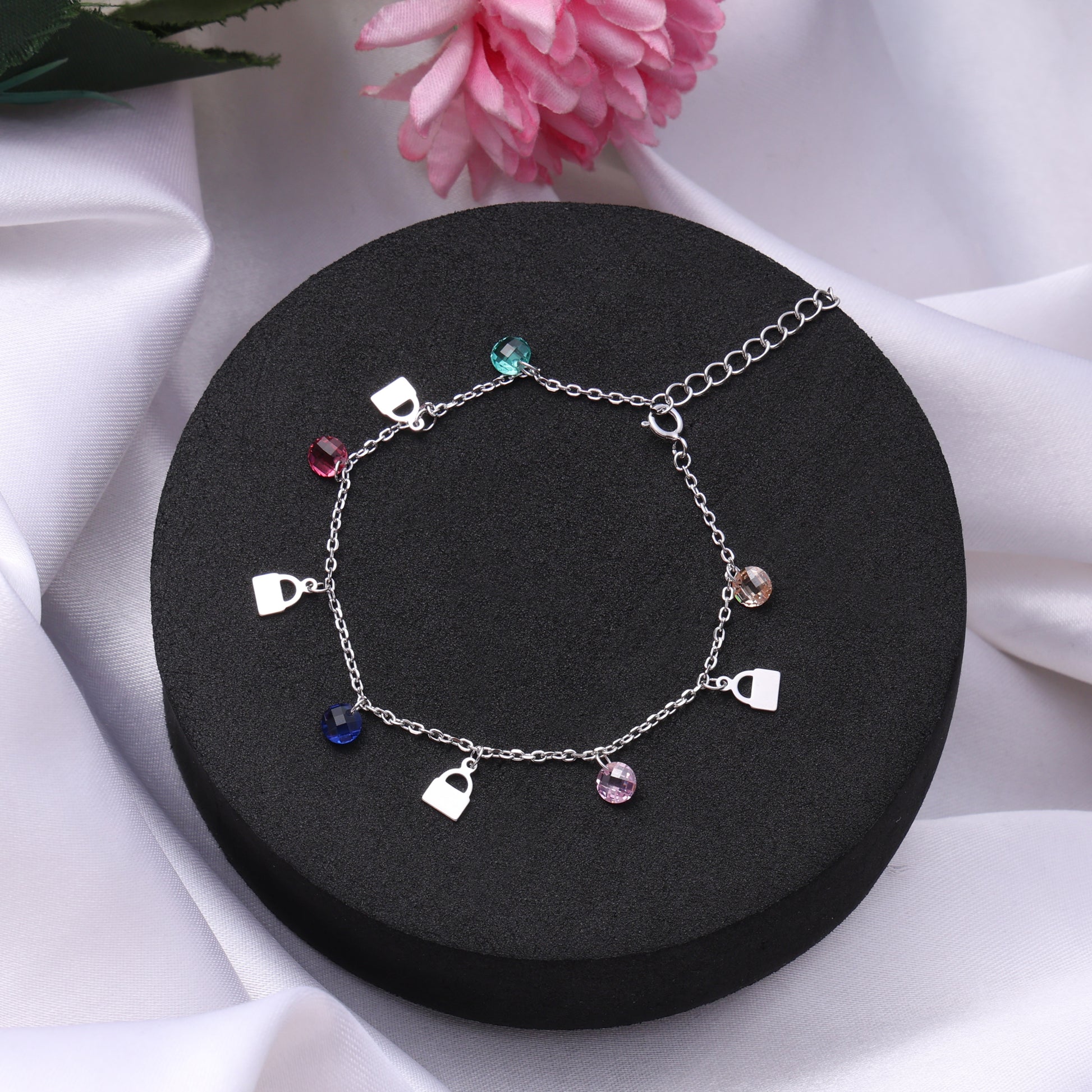 Add effortless elegance and playful charm to your wrist with this stunning 925 sterling silver crystal charm bracelet. Designed with a delicate chain silhouette, the bracelet features multiple dangling charm accents and colourful crystals that move gracefully with every motion, creating a subtle sparkle and modern appeal.